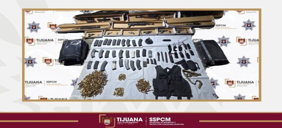 La Secretaría de Seguridad y Protección Ciudadana Municipal (SSPCM) de Tijuana aseguró 11 armas de fuego, 33 cargadores y 495 cartuchos útiles de distintos calibres, así como ocho radiocomunicadores, un chaleco antibalas y diverso equipo relacionado con armamento, tras atender un reporte ciudadano.